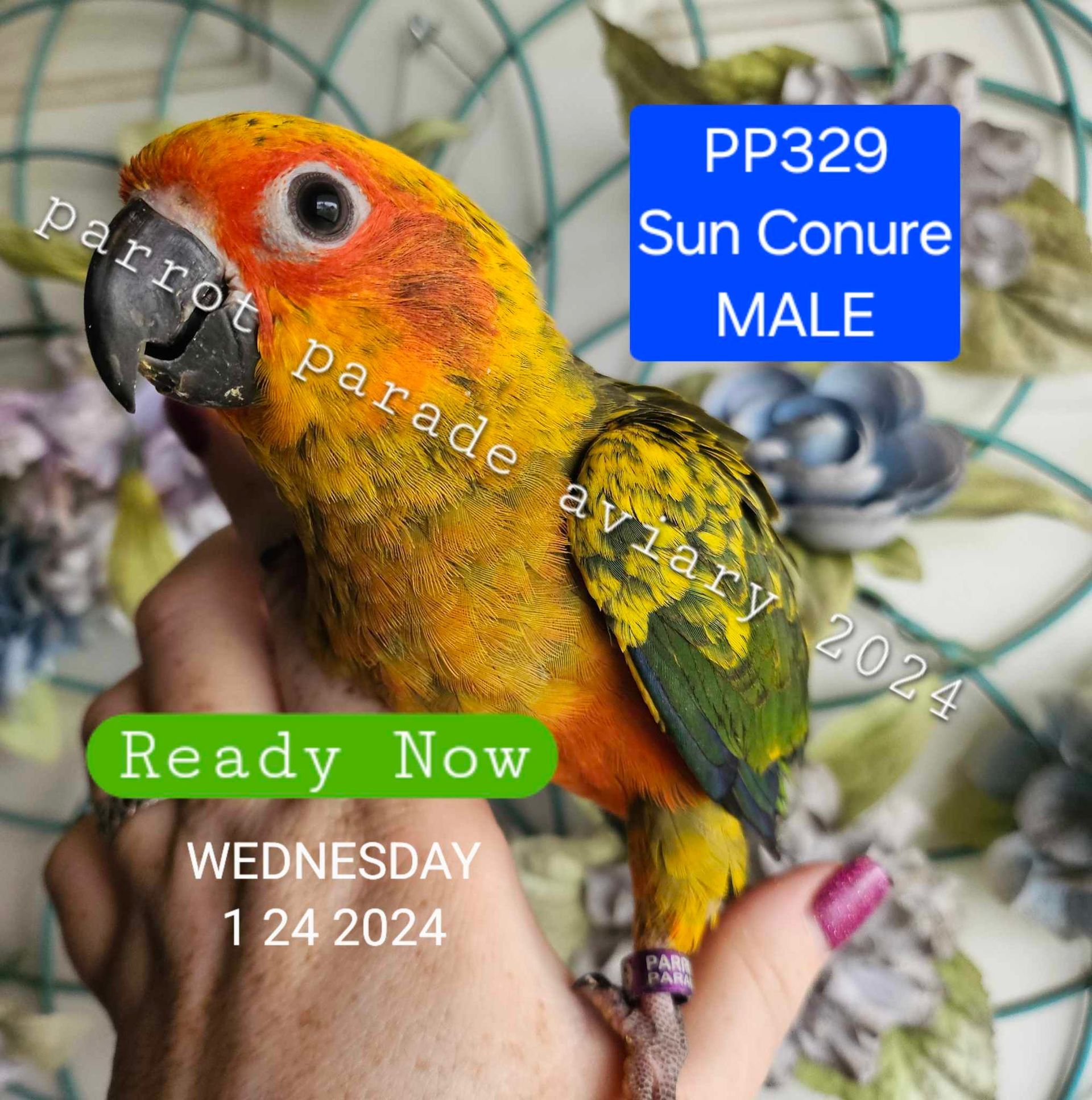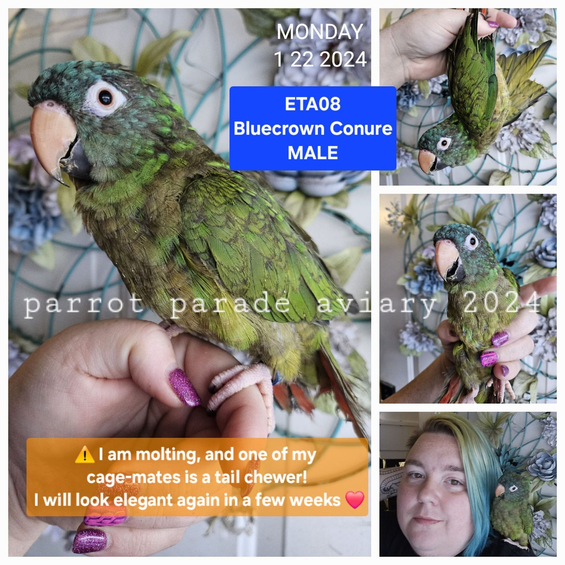 Comments: Flighty in the cage due to age, but sweet once he has had a chance to come out. This boy would ride on your shoulder all day if you let him! He is currently going thru a molt, but looks a little extra rough due to sharing cage space with several other rowdy conures. One of his cage mates has nibbled off most of his tail feathers, so he's quite clumsy trying to fly without them, but they will grow back in soon! Gets along great with other birds.